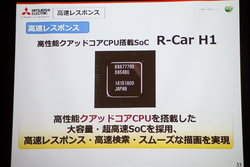 高速レスポンスも特徴とのこと。高性能クアッドコアCPUを搭載したSoC「R-Car H1」を採用し、高速レスポンスと共に、スピーディーな検索やスムーズな描画も可能にした。また、ルート検索については、同社の従来機種と比較して約5.6倍のスピードを実現したという。