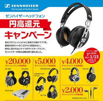 ゼンハイザージャパンは、ヘッドホン/イヤホン購入者を対象に、最大20,000円のキャッシュバックを行う円高還元キャンペーンを10月14日から実施する。期間は2017年1月15日まで。