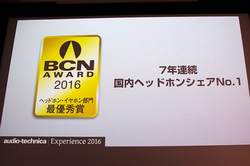 このように新製品が好調だったこともあり、7年連続ヘッドホン国内シェアNo.1を獲得。ATH-MSR7が「Reviewed.com」で2015 Best Headphones of the Yearを、ATH-R70xがNAMM 2016のTECアワードを受賞したことも紹介し「国内はもちろん海外でも高い評価を得ることができました。グローバル化の推進が功を奏したものと思います」と語った。