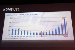 「ホームユース」製品としては、VMカートリッジを刷新。2008年にスタートした「レコードストアデイ」をきっかけにアナログ市場は拡大しており、2014年には3億4,700万円という、前年比50%増の市場に成長した。世界的に見ても日本国内のレコード売上げ枚数は多いという。そんななか、今回発表される新VMカートリッジは、コイルを一新し高解像度と中高域のボリューム感を両立。ユーザーの好みにあわせて針とボディの組み合わせを変え、音の違いを楽しめるモデルになっているという。ターンテーブルも実に7年ぶりに新モデルを投入した。