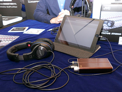 来場者が手持ちのプレーヤーを使ってHA-MX100-Zの試聴を行うことももちろんできるが、さらに“ビクタースタジオならでは”の展示も工夫。ハイレゾ配信サイト「HD Music.」で配信中のハイレゾ音源などを収めたiPadも会場に用意しており、ビクタースタジオのヘッドホンを使ってビクタースタジオ“直営”のサウンドを体験できるようにしている。