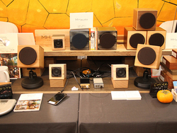 MH Audioは、6階ロビーに設けたブースにて、木製スピーカー「WAON(和音)」の新筐体を採用した2モデルと、陶器を使用したスピーカー「KION(輝音)」などを展示している。