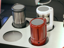 VECLOSのブースでは、サーモスが培った魔法びんの真空技術を応用したスピーカー「SSA-40S」を展示している。