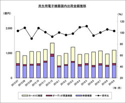分野別にみると、オーディオ関連機器は75億円(前年比109%)、映像機器は516億円(前年比102.1%)、カーAC機器は同じく527億円(前年比103.3%)と、3ヶ月ぶりに全分野においてプラスとなった。
