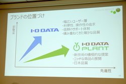 従来のアイ・オー・データブランドが、幅広いユーザーに向けた利便性・操作性の高い高品質製品を展開してきたのに対し、「PLANT」ブランドでは、より先進性を重視した新技術の積極的な提案、ニッチな商品展開を日本品質で提供していくとしている。