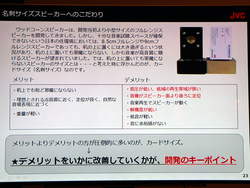 JVCケンウッドの音質マイスターである今村智氏は、「特に都会に住む人にとっては、部屋に広めの空間を持つのは難しい時代になってる。そうした、狭い環境で音楽を聴いている人たちにとっては9cm径などでも邪魔なサイズだ」と、ウッドコーンスピーカーを超小型化した理由を説明。