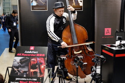 アユートが展開するAstell&Kernのブースでは、ポータブルオーディオプレーヤーAKシリーズと接続して使用するレコーダー「AK RECORDER」を用いての生録音を実施。アーティストNori Shiotaのベース演奏を3台の「AK RECORDER」で録音、その音を確認できるという取り組みが行われていた。