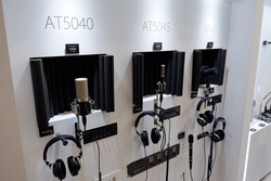 オーディオテクニカのブースでは、サイドアドレス型のマイク「AT5040」や「AT5045」、ブロードキャスト向けの大口径マイク「BP40」など、多数のマイクを展示。その収音性能を体験できるようヘッドホンなどがセッティングされていた。