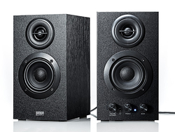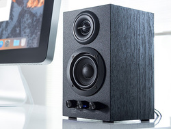 【SPEC】●形式:バスレフ式ブックシェルフ型 ●アンプ最大出力:ウーファー…5W×2、トゥイーター…3W×2(計16W) ●周波数特性:40Hz〜22kHz ●入力端子:3.5mmステレオミニ ●使用ユニット:2.5インチ ウーファー、1インチ トゥイーター ●外形寸法:110W×180H×123Dmm ●質量:約2.1kg