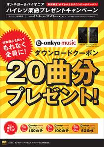 応募期間は12月1日(木)から12月29日(木)。応募者には、ハイレゾ音源配信サイト「e-onkyo music.」で使用できる「e-onkyo music 1曲無料ダウンロードクーポン」20曲分をもれなくプレゼント。さらに、応募者の中から抽選で50名に50曲分、5名に100曲分、3名に150曲分の同クーポンが当たるため、最大170曲のハイレゾ音源がプレゼントされることになる。