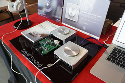 Deff(ディーフ)はPS VR体験コーナーの横にブースを設置。来春の発売を目指しているというポータブルヘッドホンアンプ2機種とトランシーバー1機種を参考出展していた。3機種はいずれもaptX HDに対応予定とのこと。ヘッドホンアンプは1台が通常のポタアンタイプ、もう1台がクリップタイプとなる。