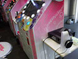 今回のイベントは、「ラブライブ!スクールアイドルフェスティバル」のアーケード版筐体を用意。これをクラリオンのフルデジタルサウンドヘッドホン「ZH700FF」やデノン「AH-D7200」、オーディオクエスト「NightHawk」、Bowers & Wilkins 「P7」、OPPO「PM-1」、フォステクス「TH610」といった高級ヘッドホンと組み合わせることで、高音質でスクフェスを楽しむことができた。