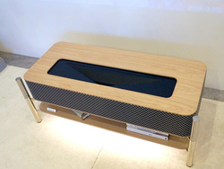 一般的なテレビ台ほどの大きさで、壁にぴったりとつけた状態からでも80インチでの投映が可能な超短焦点プロジェクター。じっくりと映画などを鑑賞するというよりは、映像だけでなく音楽や本など様々なコンテンツへ新たに出会えるような工夫を盛り込んだ。