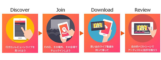 イベント会場を訪れた人が指定されたエリアに入ると、PROJECT REVIEWNのwebサイトにチェックイン画面が自動的に表示。チェックインすると、イベント関連コンテンツを購入できる。Tシャツやタオルといったイベントグッズの映像版、というイメージだ。
