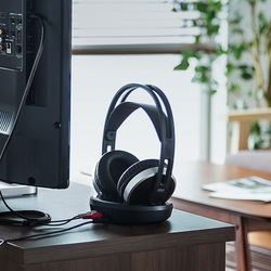 ヘッドホンは、40mm口径のダイナミック型ドライバーを搭載。周波数特性は30Hz〜20kHzをカバーする。700mAhの充電池を2個内蔵しており、最大10時間の連続再生に対応。充電端子同士をあわせるようにヘッドホンを送信機に“置くだけ”で充電でき、5〜7時間でフル充電となる。