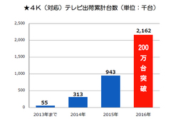 4K(対応)テレビは、出荷台数121万9,000台(対前年比193.6%)、出荷金額2,451億円(同166.4%)と躍進。、2011年の発売開始からの出荷台数の累計は216万台となった。