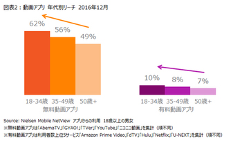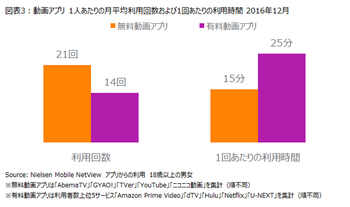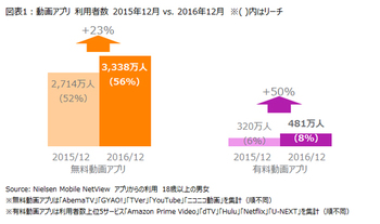 ニールセン デジタルは、スマートフォン視聴率情報「Nielsen Mobile NetView」のデータをもとに、2016年12月の日本における無料/有料動画アプリの利用状況を発表した。