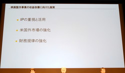 またモバイル機器向けのゲームアプリを今春から随時販売予定としており、自社IPをモバイルゲーム化する展開にも取り組む姿勢を見せている。なおゲーム&ネットワークサービス分野の通期見通しとして、売上が向上し利益率は下がっている理由については、「海外売上が大きいため、為替の影響で売上が膨らんでおり、結果として利益率が下がっている」と説明した。