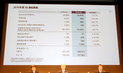 ソニーは、2016年度第3四半期決算を発表した。昨年4月1日から12月31日までの累積業績は、売上高が5兆6,996億円(前年同期比9.3%減)、営業利益が1,943億円(同49.8%減)、当期純利益は456億円(同80.7%減)だった。