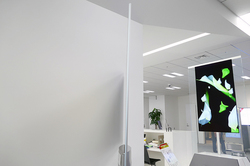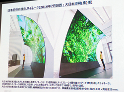 有機ELデジタルサイネージは昨年後半から展開を開始。これまでの液晶ディスプレイではできなかった展示が可能になるとし、10枚のパネルを輪の様態にしてそれを2つ交差させたオブジェのような展示や、パネルで曲線を作って囲ったロビースペースなど、有機ELの美しさと曲げられる特性を生かした事例などが紹介された。