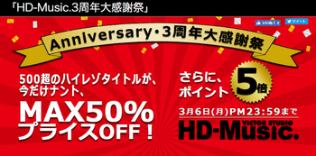 音楽配信サイト「HD-Music.」は、2月6日にサイトオープンから3周年を迎えた。これを記念して、ハイレゾタイトルが最大50%オフになる「HD-Music.3周年大感謝祭」を開催している。