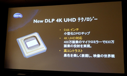 またHT8050の最大の長所として、「いわゆる4Kエンハンスメント(画素ずらし)方式のモデルに対して2倍の解像度を持つ」ともコメント。「画素ずらし方式では色モレが発生するが、4K DMD DLP技術を活用すれば、色ズレのないメリハリのついた処理ができる」としている。