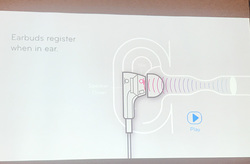 このイヤホン内蔵マイクを利用し、装着状態を認識する機能も装備。この機能を利用し、耳から外すと再生を自動停止する「オートポーズ」も利用できる。なお装着状態の判定はセンサーなどではなく「完全にアコースティックで」行っているのだという。装着した際の反射音をマイクで拾い、それをもとに装着しているかどうかを判断しているものと思われる。