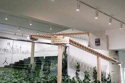 内側には階段状の“パークの木琴”を展開。314本のカンバス材で造られており、5分程度の間隔でソニービルスタッフが木の球を転がして音楽が鳴る仕組みになっている。楽曲はルイ・アームストロングの「What A Wonderful World」。