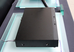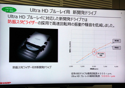 スタビライザーの搭載により、5,000rpm時で、現行ドライブに比べて約2.5dBの騒音低減が実現したという。シャープは「5,000回転にもなると、対策をしないとかなり騒音が気になる。これを抑えるためにスタビライザーを採用した。密閉性を高められ、ホコリの引き込みも抑えられることも利点」と説明する。なお読み込み精度とディスク読み取り精度も高まり、読み取り用のLSIも新しいものを採用している。