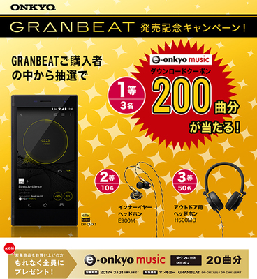 本キャンペーンでは、明日2月24日から3月31日までの期間中に“GRANBEAT”「DP-CMX1」を購入したユーザーを対象に、応募者全員にe-onkyo music ダウンロードクーポン(20曲分)をプレゼント。また、抽選で最大200曲分のハイレゾ楽曲やヘッドホン「E900M」「H500MB」が当たる(詳細はこちら)。