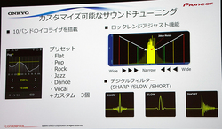 さらに「自分だけのカスタマイズ機能」にもこだわっているとのこと。10バンドのイコライザを搭載して好みの音質に細かく追い込めたり、ロックレンジアジャスト機能によりジッターノイズを調整することなども可能。「上位機種に負けないカスタム機能を備える」と強調した。