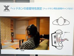 個人特性の測定のために、MEMSマイクを使用した超小型の耳内音響マイクシステムを新たに開発。このマイクを装着してまずスピーカーからのテスト音で測定し、次にマイクの上からヘッドホンを装着してヘッドホンからのテスト音での測定を行う。この2回の測定データを基に、音楽信号に対して「スピーカー再生音場生成→ヘッドホン再生音場キャンセル」という処理を行って、ヘッドホンを通してスピーカー再生時の音場を再生する。