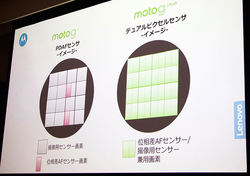 上位モデルのMoto G5 Plusは、メインカメラに「デュアルピクセル・センサー」技術を採用。これにより一般的な従来のスマートフォンと比較して約60%の高速フォーカスが可能とした。