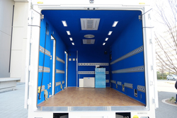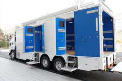 中継車に対しての支援車となる「SA-1」は、80kVAの発電発動機を搭載しており、SR-1への電源供給(50kAV)をはじめ、音声機材や収録機器などの外部機器にも供給可能。中継機材の運搬後に、機材をおろしたスペースを音声制作や収録環境として活用できる、室内長4,580mm、室内幅2,290mmの多目的利用荷室を備える。
