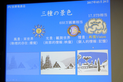 この新技術を説明する前に、まず近藤氏はこれまでの技術を振り返った。同社では“三種の景色”として風景、光景、情景を定義。「風景は実世界で、物理的存在としての環境。光景は観測世界で、刹那的情報となる映像。情景は再現vision、個人的情報として記憶されるもの。つまりオブジェクトである風景を、目で光景として観測し、それが個人の記憶により価値が高まったものが情景」とした。