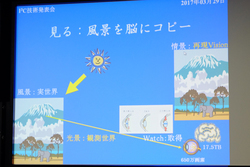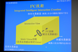 そして2015年のICSC技術では「オブジェクトと自分の関係が認知できる、相対光景の創造。これまではカメラで撮影された映像カメラが置かれた位置で撮影されたものを忠実に再現してきたが、この技術ではその位置に縛られず、自分がその場所に行き、見たいところを注視したかのように感じられる」と述べた。