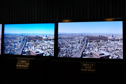 デモでは、ディスプレイにアイキューブドシー技術を適用した映像には4K-SDR 100nitのモニターを使用し、比較用のリファレンスとして4K/HDR 510nitのTVが用意された。映像はアイキューブド研究所の入るビルから撮影された街並みで、4K非圧縮のもの。まずアイキューブド技術を使用しない状態では、ディスプレイの輝度の差から、リファレンスのTVの方が圧倒的に明るく見える。