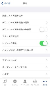 今回のアップデートにより、機能として追加されたのは「ハイレゾお試し音源ダウンロード」機能と「レジューム再生機能」。それぞれアプリ内の「設定」メニューから選択でき、ハイレゾお試し音源ダウンロードでは、用意された複数の楽曲を無料でダウンロード、再生することができる。レジューム再生機能は前回停止位置からの再生を行うもので、オン/オフの切り替えが可能。