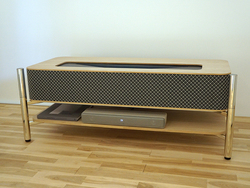 この「-It's all here-」は、一般的なテレビ台ほどの大きさで、最大120インチでの4K投映が可能な超短焦点プロジェクター。じっくりと映画などを鑑賞するというよりは、映像だけでなく音楽や本など様々なコンテンツへ新たに出会えるような工夫を盛り込んだ。