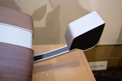 キャビネットの木部にはソナス伝統のウォールナット仕上げが施され、曲げ加工や接合加工には、最新の木工技術が用いられた。金属部は、剛性が高く加工性に優れたアルミニウム合金を使用。全体を梨地仕上げとして木部との調和を取っている。