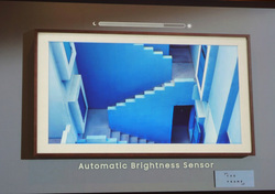 デザイン性を高めるため、ベゼルの側面にはブラウン/ベージュ/ホワイトの3色から選べる額縁のようなデザインの金属製フレームを用意。マグネットで簡単に着脱ができる“絵画のようなテレビ”を魅力として訴求する。人感センサーや明るさセンサーを統合する「インテリジェントセンサー」が内蔵され、ユーザーがテレビの前からしばらく離れると、テレビの映像から「アートモード」と呼ぶ壁紙表示のモードに自動で切り替わり、静止画像などを表示する。映像の明るさを室内環境の明るさと自動で合わせて、アートモードの表示を絵画のような質感に整える効果も持たせた。