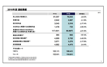 ソニー(株)は、2016年度の連結業績を公開した。売上高は7兆6,033億円、営業利益は2,887億円と、どちらも前年度に比べて微減。純利益は733億円と、前年度比でおよそ半減した。