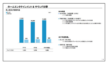 なおホームエンタテインメント&サウンド分野の2017年度見通しについても、高付加価値モデルへのシフトによる製品ミックスの改善によって増収を見込み、営業利益もほぼ2016年度並みになるとしている。