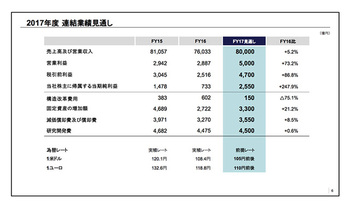 2017年度の業績見通しは、一転して増収増益となっている。売上高は8兆円、営業利益は5,000億円。純利益も2,550億円と予想している。特に半導体と映画がともに大幅増益となるとの見通しで、半導体は1,278億円の増益、映画は1,195億円の増益を見込む。