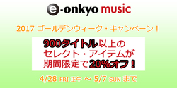 e-onkyo musicは、本日4月28日(金)から5月7日(日)まで、「2017 e-onkyo music ゴールデンウィーク・キャンペーン」と題して20%オフのセールを実施する。