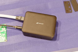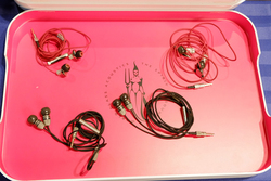 ポータブルプレーヤーやポータブルアンプなどと重ねて使用する電磁波吸収素材を用いたアクセサリーで、空いた端子に接続することでアースを取るための3.5mmプラグやmicroUSBプラグを装備。来場者の意見を参考に、どの端子が有効かなど製品化に向けて開発を進めていくという。