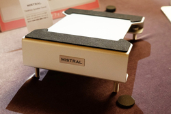 エスカートは音響パネルやオーディオボード、調音アクセサリーなどを扱っており、同社ブースではMISTRALブランドのオーディオ用ボード「EVA」を展示。電磁波吸収素材を使用し、USBケーブルによるアーシングシステムを持つ同製品のノウハウを活かし、ポータブル向けモデルとして「EVA Portable」を参考展示していた。