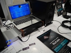 KORGブースでは人気の真空管「Nutube(ニューチューブ)」と「DS-DAC-10R」が出展。同社製の「Nutube」搭載アンプは、現在も開発を続けているという。
