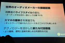 また玉木氏はスマホとオーディオの関係についても、自身の考えを紹介。「スマホはどんどん便利になっているが、一般ユーザーは、すぐにその便利さを当然のもの、所与のものとして捉える。だからスマホのようにかんたんに操作できることがオーディオ機器にも求められる」と述べ、その利便性や簡便性を体現するものとして、同社のSpotify Connectを紹介した。Spotify Connect製品は増え続けており、すでに80以上のブランド、300以上の対応製品が存在するという。