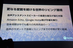 さらに最近の動向として、米国ではAmazon Echo、Google Homeなど音声アシスタントスピーカーが急激に普及していることも紹介。あるデータでは米国ですでに3,000万台が普及しているという。「○○を再生して、と言ったらすぐに再生がはじまる。ものすごく便利で、これもスマホと同じように、一度使ったら離れられなくなる」とした。